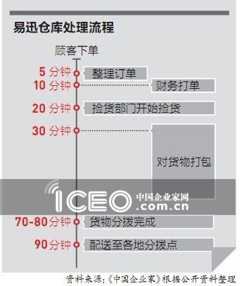 在易迅的北京仓库里,巨大的生产调度屏幕好似火车站候车厅的车次显示终端。在这里可以看到每一个作业时间点上作业状况以及数据,数据会以不同颜色显示出来,黑色代表正常,红色代表操作有环节“延时”。按照易迅的规定,从下单到出仓的过程不超过100分钟,其中每个环节应占用的时间做了严格划分。如果“红色”出现,相关组别的负责人第二天要进行检讨。