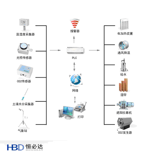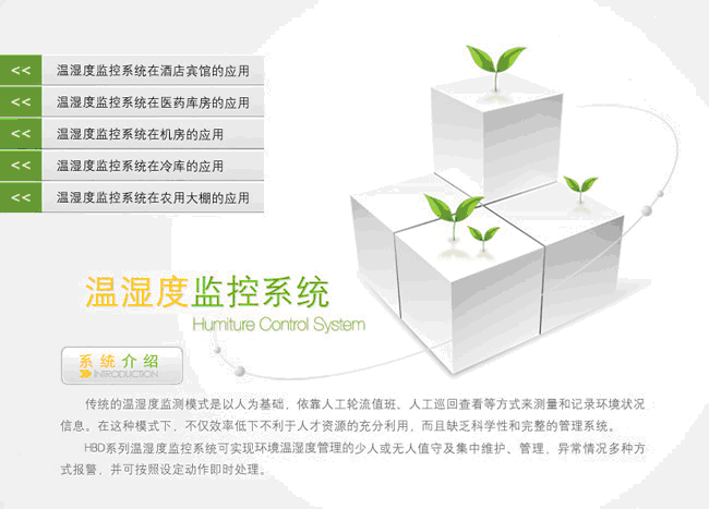 温室大棚内温度、湿度、光照强弱以及土壤的温度和含水量,对大棚内的作物生长起着关键性的作用。本系统主要完成对大棚内空气的温湿度和土壤的温度及含水量等参数的采集、存储,并具有向监控中心传送数据以及执行监控中心的指令等功能。本系统采用常规的 RS-485 等有线连接的数据通信方式,配有专用的温湿度环境监控软件,组网方便,可靠性高、成本低、便于维护和对环境进行数据存储和分析,在设备异常情况下能以多种形式的报警通知相应人员,能24 小时不间断实时监控记录。该系统可广泛运用于农业温室大棚内的蔬菜、水果、育苗、花卉养植等领域。