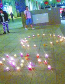 小伙当街点燃50支彩色蜡烛杯并摆放成心形图案,等待女主角出现。读者供图