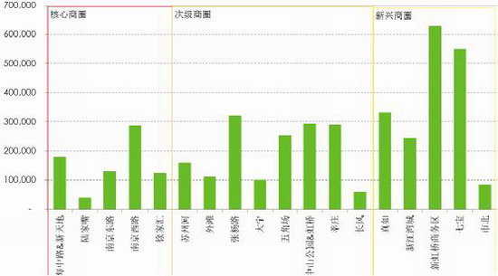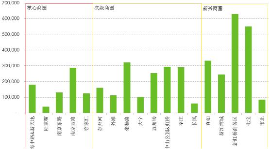从未来供应量来看,绝大部分的商业供应量主要集中在新兴商圈,2014年至2016年,核心商圈的供应量合计约63.5万平方米,而非核心商圈的供应量约为272万平方米,是核心商圈的4.3倍。部分市中心的商业项目以重新定位调整的策略来面对竞争日趋激烈的市场环境,例如:正在进行整体改造和品牌调整南京西路商圈的金鹰国际购物中心。
