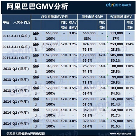 4,2014年连续3个季度中,阿里的流水(GMV)同比增长都低于50%,而天猫GMV的同比增长也低于80%,也反映出市场竞争对阿里巴巴流量和平台成交额的影响。