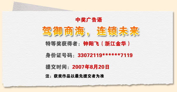 | 科脉大型商业连锁管理软件——御商广告语经过一个半月的征集,终于抢鲜出炉了!从近4000条应征作品中脱颖而出,我们向其创作者钟阳飞表示祝贺!该广告语从软件行业特性、功用以及内涵表现,都十分符合科脉的产品定位。在此,我们要感谢所有参与应征的朋友,感谢你们一直以来对于科脉御商的支持,这将激励我们继续为广大客户提供更优质的产品和服务。现将获奖者名单公布如下: