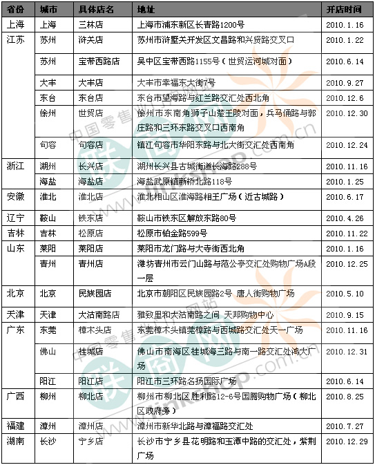 2010年新开门店具体分布: