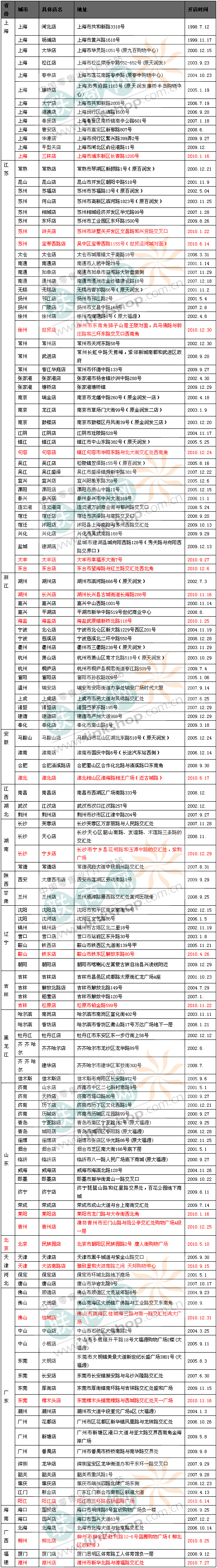 注:红色字体部分为2010年新开的门店