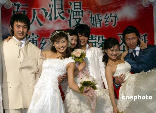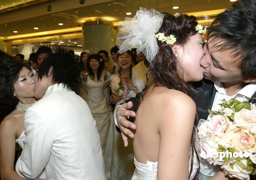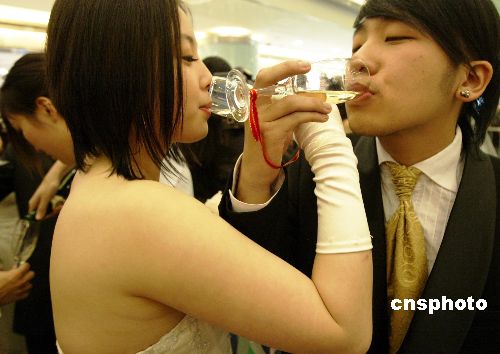 12月22日,在北京东方新天地商场,50对新人举行婚庆典礼,“圣诞老人、圣诞女郎”为新人主持婚礼,百人浪漫婚约上新人相互送鲜花、喝交杯酒,随着音乐翩翩起舞,为即将来临的圣诞节营造浓郁的节日气氛。(中新社发钱兴强摄)