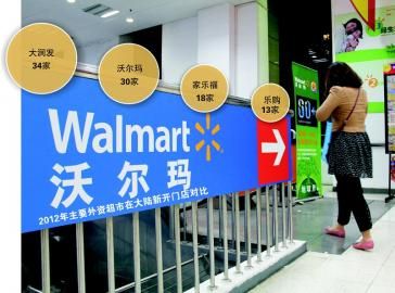 中国零售市场增速放缓让全球三大零售集团沃尔玛、家乐福和乐购在华门店拓展的成绩单都不太好看。根据联商网提供的2012年主要外资超市在华门店数量对比显示,沃尔玛、家乐福和乐购三巨头2012年在华开店数量都不及去年