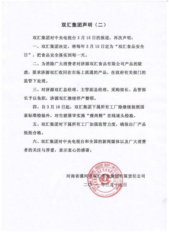 双汇集团对中央电视台3月15日的报道,再次声明: