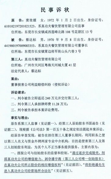 从获得的诉状中来看,该案件的原告是真功夫公司监事窦效嫘,即潘宇海之妻。