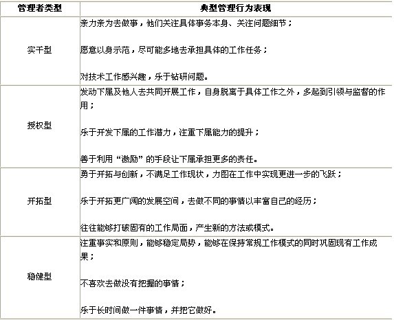 基于管理情景的复杂性,很少存在纯粹的单一类型管理者,他们只是偏向某种管理风格,如偏向开拓型管理。大部分的个体会是多个类型的综合体,如实干-开拓型、实干-稳健型、开拓-授权型、稳健-授权型。四类管理者在工作中的行为表现如下: