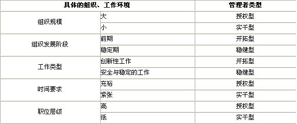 一般来说,管理者类型与组织、工作环境的关系如下: