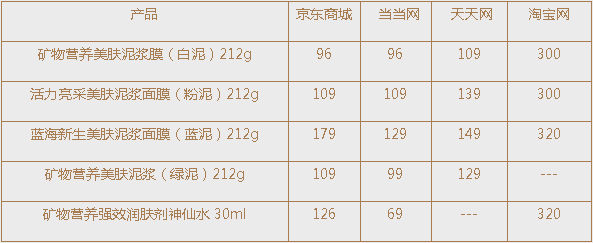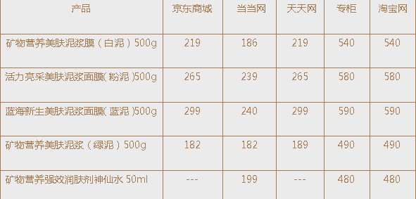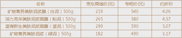 为了进一步辨别产品情况,新快报记者在京东商城上选取了4款贝佳斯的最热卖产品做为样品,分别是矿物营养美肤泥浆膜(白泥)500g、活力亮采美肤泥浆面膜(粉泥)500g、蓝海新生美肤泥浆面膜(蓝泥)500g以及矿物营养美肤泥浆(绿泥)500g,并以此与“贝佳斯”在广州的专柜——广百中怡店的价格进行了对比,结果显示:京东商城的价格比专柜价格低逾50%,如专柜卖540元的白泥在京东商城上仅售219元,专柜卖580元的粉泥在京东商城仅卖265元,专柜卖590元的蓝泥在京东商城上仅售229元,专柜卖490元的绿泥在京东商城仅售182元。