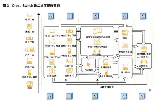 最开始需要设计一条路线,使消费者从被动接触到主动行动。把他们引向你设定的场所,如网络、活动、展厅、店头等;在检查和修改路线时,一定注意确保参与沟通活动的消费者人数规模,如果等候体验的时间太长,或者可以参与的人数比较少,都不是很好的导线设计。最后,Cross Switch不等于媒体组合。媒体组合罗列了到达目标人群的媒体分布,而Cross Switch是可以引导目标人群行动的导线;媒体组合是媒介预算分配,而Cross Switch是沟通导线设计。可以说Cross Switch是二维度矩阵营销,如图3所示。