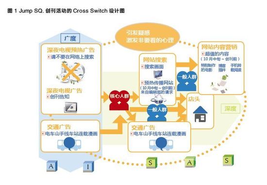 最终,在漫画杂志市场日趋疲软的状况下,这个活动使得“Jump SQ.”新创刊即加印10万册,并最终发行60万册的主题传播效果。这个案例的Cross Switch设计图如图1所示。