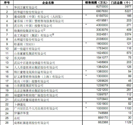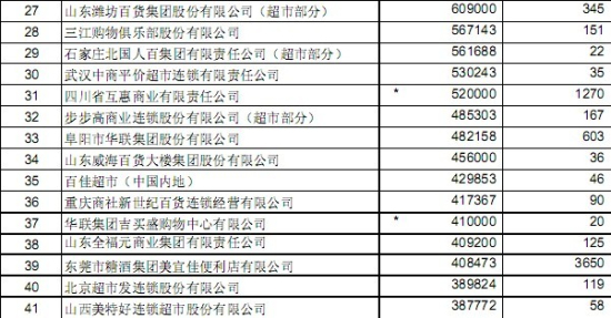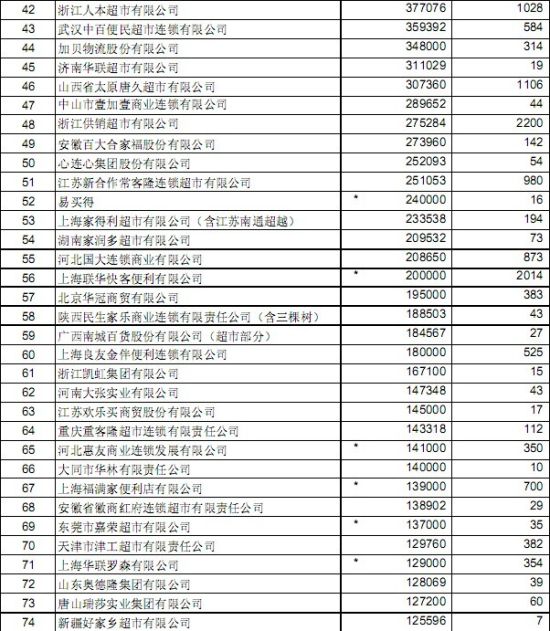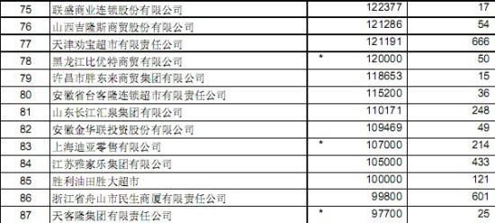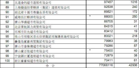今年连锁百强的改进,一是在统计口径上,上市公司按含税口径计算,与年报数据有所不同;上市公司外,非上市部分要求按业务分拆销售额和门店数;企业内部配送业务不重复计算;加盟店销售超过整体销售50%的,不在“连锁百强”中排名;剔除批发市场、生产资料、经营场地交易额等。二是专家参与,对出入较大的数据进行调查与评估。
