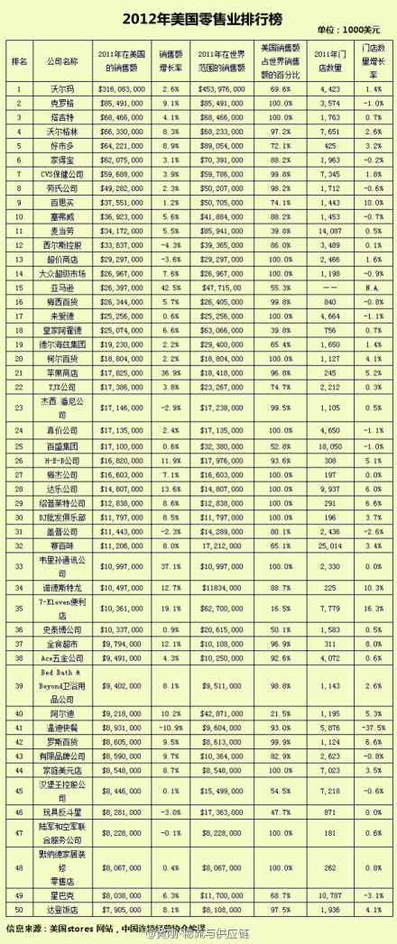 从这份年度排行榜可以看出零售行业是一个相当复杂多变的行业,超霸级别的零售商(从排名第1位的沃尔玛到排名第27位的美捷)在新开商店的规模上都有所缩小,而其他的零售商(尤其是排名第28位的达乐公司和排名第48位的默纳德)却开了规模较大的分店。