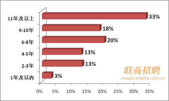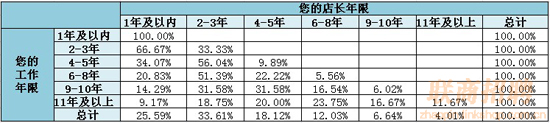 参与本次调查的门店店长工作年限以11年以上为主,占调查总人数的33%,为进一步了解参与调查者的工作经历,我们对参与调查者的工作年限和当店长年限进行了分析,从中发现大部分资深店长在从事店长职业之外还有过其他工作经历(例如:工作年限在11年以上的店长,72.1%从事店长一职4年以上),而年轻店长则成长迅速(例如工作年限在4-5年以内的店长,65.9%已从事店长一职2年以上)。