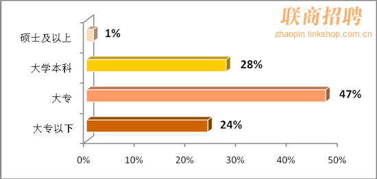 本次参与调查的门店店长学历以大专和本科为主(占比75%),其中大专学历占比最高,达到47%。