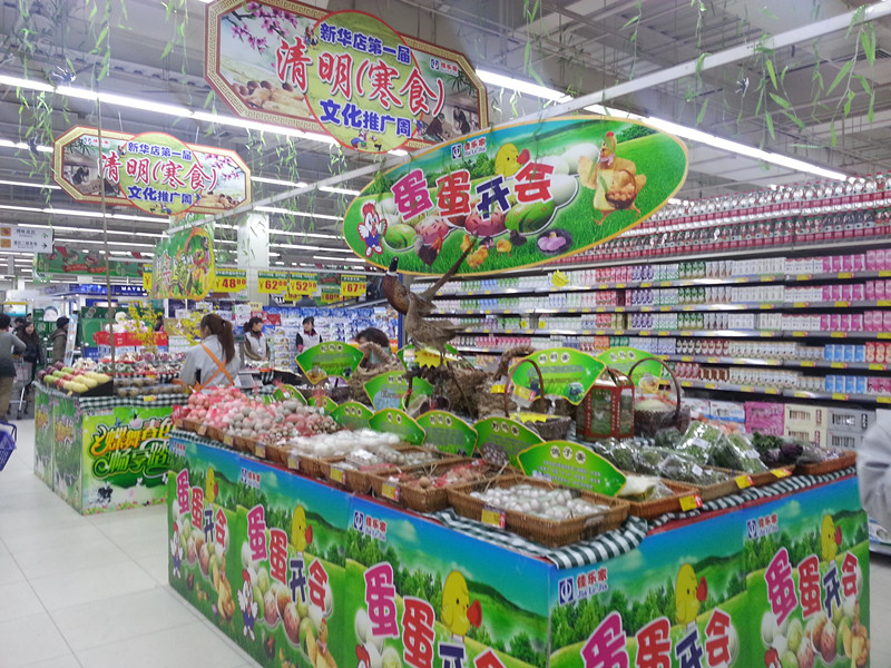 4、关联陈列:陈列促销的最终目的是实现销售的最大化,该超市不仅将新奇特蛋类突出陈列,考虑到清明、寒食节期间,当地民俗饮食习惯是饼卷鸡蛋,各门店还积极增加了单饼、熟鸡蛋、麻辣龙虾、海虹、田螺的陈列,也就是关联陈列,现场售卖,通过色香味刺激消费者的食欲,实现关联商品的有效促销。