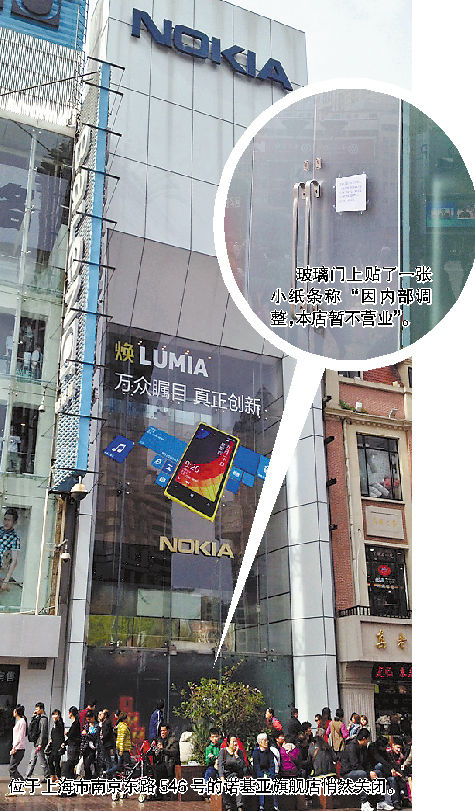 昨日下午3时左右,记者赶到诺基亚位于上海南京东路步行街的旗舰店时,该店已大门紧闭。和周边的商户相比,诺基亚这家旗舰店的门面并不大,但有五六层楼高,大门从里面上了锁,从门缝看过去,货架还在,但已空空如也。玻璃门上贴了一张小纸条称“因内部调整,本店暂不营业。手机售后请至福州路诺基亚客户体验中心,或致电客服热线”。旁边商户的店员告诉记者,这家店是在3月31日关闭的,店里面应该还有工作人员在,不过记者敲了一会门,始终没有人开门。