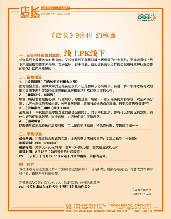 为规范杂志来稿管理,方便作者投递稿件,即日起,《店长》杂志统一投稿邮箱为dz@linkshop.com.cn,邮箱前缀为“店长”拼音首字母,后缀为联商网通用邮箱地址,简单易懂,希望大家广而告之,欢迎踊跃来稿!另:《店长》最新官方QQ号是:2589786287,如有疑问,欢迎联系。