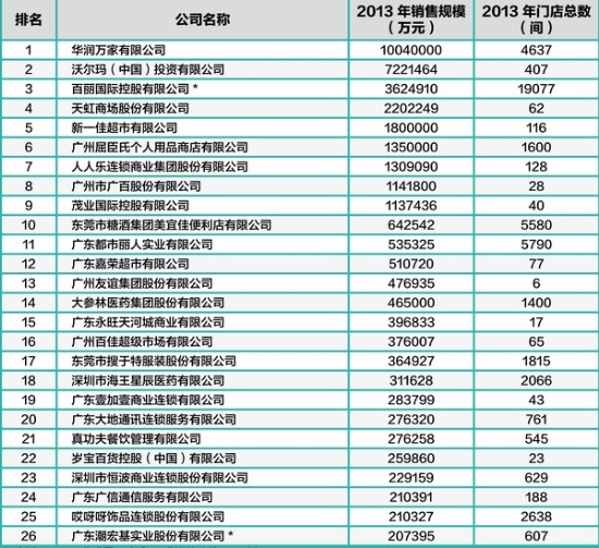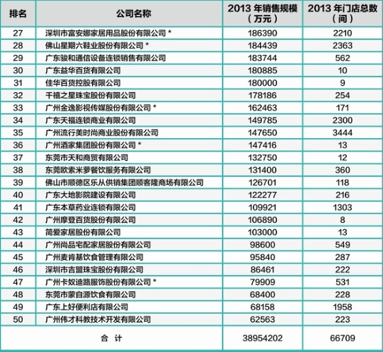 2013年,广东连锁五十强企业销售规模3895亿元,占当年广东社会消费品零售总额15.3%。与2012年度连锁五十强对比,销售规模增长8.2%,门店总数65709间,增长5.2%。进入连锁五十强企业最低门槛62563万元,较上年增长11.8%。连锁五十强企业以广州和深圳的民营企业为主,基本涵盖零售业、餐饮业、教育培训业、文化娱乐业等多个行业,其中不乏大型企业和上市公司,她们已成为广东本土企业走向全国化甚至国际化发展的典范代表,引领着我国连锁经营的发展潮流。