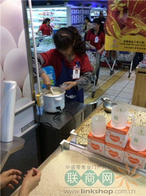 (图:精品大米和普通谷类是分区域陈列的,这是白云店新引进的蟹田米,7.99元/斤,促销价是5.99元,比泰国香米还高一个档次。超市还为新品促销做了个“看世界杯,品蟹田米”的活动,买米还送个亚克力杯,现场有新米的试吃活动。)