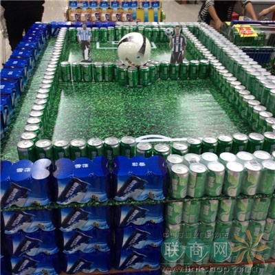 (图:这是世界杯的促销陈列,还有赛事进程表。最后一张图的小瓶装哈尔滨啤酒在世界杯赛事期间的销量非常高。值得一提是那个货架,李志坚在加入白云店后公司对所有货架和设备都进行了更换,并请了新的保洁公司,总耗资300余万元,使整个超市的营运提高了一个档次。)