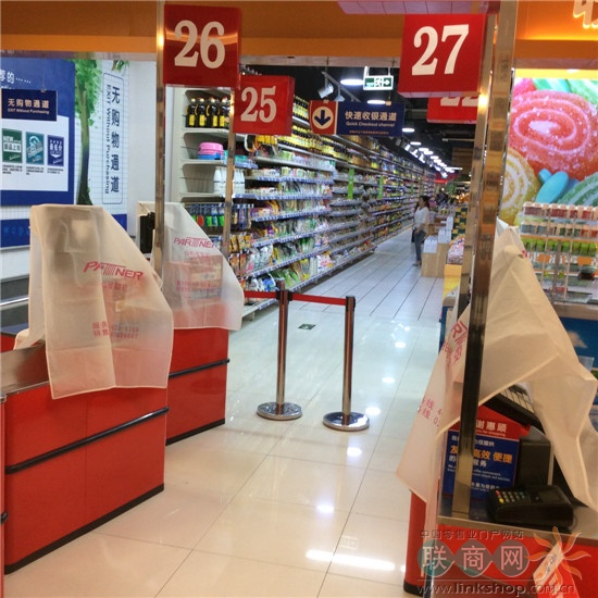 (图:在收银处的两边都有无购物通道,如果没有采购商品,或有急事想离开商场的可以从这里通过。业内许多超市都还无法做到这点。罩着的四台POS机是快速结算机,只有人流高峰期时才会启动,能有效减少排队的情况。)