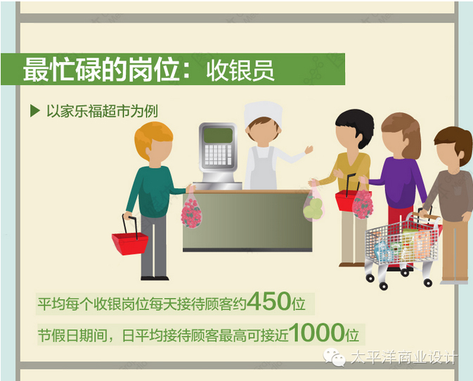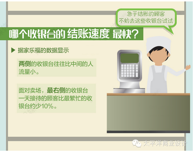 超市购物,结账时很考验人的耐性。哪个收银台结账最快?数据显示,两侧的收银台往往比中间的人流量小。而面对卖场,最右侧的收银台一天接待的顾客,要比最繁忙的收银台约少10%呢。