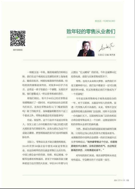 今年是实体零售和电子商务高度结合的一年,对于互联网,无疑是年轻人的优势,是老一代零售人所不具备的。未来,零售不会仅是简单的堆头陈列和门店促销,同样不会仅靠一台电脑打天下,互联网和实体门店的有机结合将会使零售业再上一个台阶。这便是留给年轻的零售从业者们的新机遇。