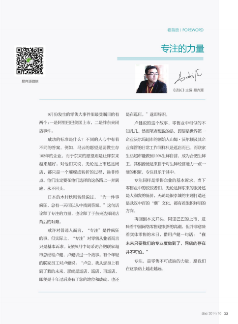 或许对普通人而言,“专注”是件疯狂的事。但实际上,“专注”对零售从业者而言只是基本诉求。记得9月中旬采访合肥联家超市总经理卢健,卢健讲过一个故事。有个年轻的联家员工对卢健说:“卢总,我从您身上看到了我的未来,那就是巡店、巡店、再巡店,即便是十年过后我有了您的地位和成就,也还是在巡店。”遂即辞职。