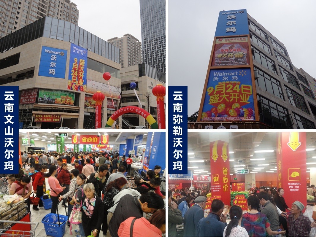 9月24日,沃尔玛在湖南攸县、广西南宁、云南文山及弥勒的4家大卖场同一天开业,除南宁以外,其他3个城市均是沃尔玛首次开设门店的新兴城市。月底前,沃尔玛还将在四川广汉和广东深圳的横岗再增2家新店,也就是说,沃尔玛将在一个星期内连开6家新店。