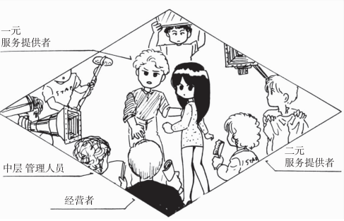 对于演员提供的演技,顾客有时会哭、有时会笑,而且还要花钱买。而支持演员演出的后台工作人员,可以说是二元服务的提供者,他们为演员提供服务。导演则是发挥演员所具有素质和能力的指导者,而不是管理者。