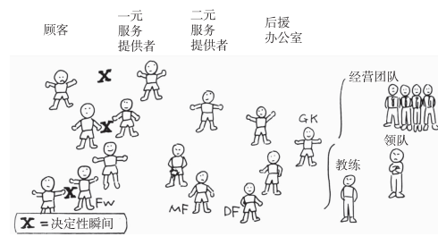比棒球的例子更容易理解的是足球。那是因为前锋(FW)、中场球员(MF)、防守(DF)、守门员(GK)的职责更易于说明。与棒球相比,足球对速度的要求更高,要求各防守位置的运动员在刹那间做出准确判断。身为经营者的领队或教练如果只相信自己一个人的能力,比赛是不能获胜的。另外,我认为将足球的例子用在说明和顾客的关系及“关键时刻”上也令人更加容易理解。