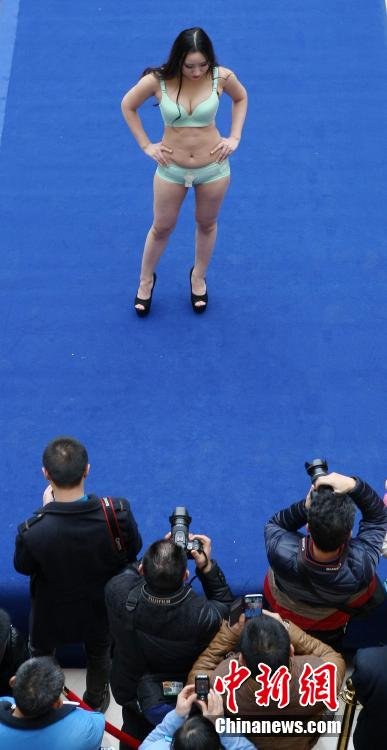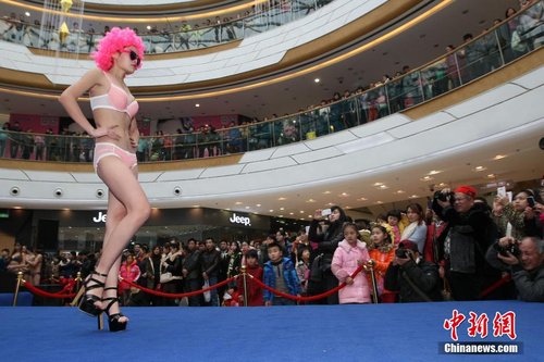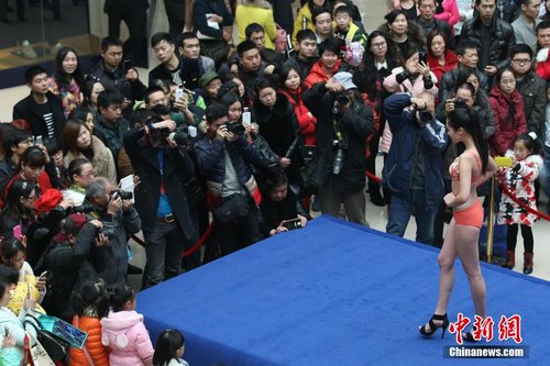 2015年1月17日,“三九”天的最后一天,重庆万州某商场,辣妹穿着性感内衣展示迷人身材,吸引上千市民驻足围观拍照。中新社发 CNSPHOTO