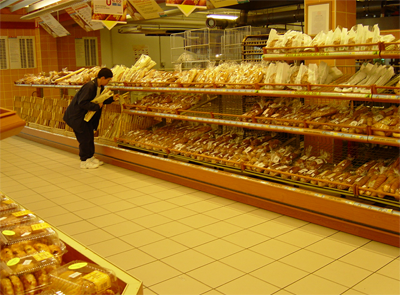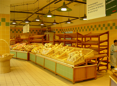 本图片中可以看出两种不同式样的面包架,多层立式的台面稍有倾斜,便于顾客的视觉浏览,另一种则配有稍深的筐,能够保证陈列的量感,克服了用白藤篮量感不足的缺点。