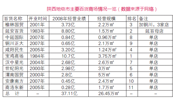 陕西的地级市百货业发展相对较缓,这和西北的人口组成及地理环境有很大关系。至今发展较好的,除了开元和民生的分支机构,还有榆林国贸百货、延安百货大楼和中延国际、铜川正大百货、咸阳民生百货、宝鸡商场、渭南国贸百货、汉中星光百货和世纪阳光、安康南方百货和商洛东新百货等。