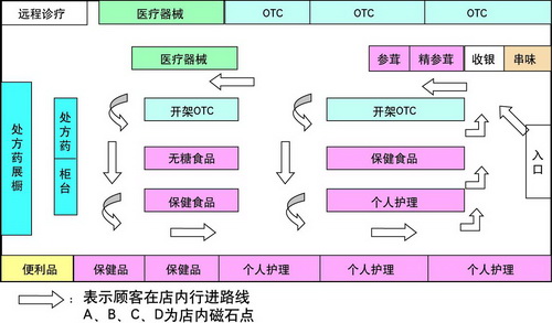 我们对一家开架药房A店进行了动线设计,如图一所示: