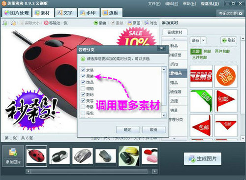 在默认状况下,“美图淘淘”只显示新品、店铺信誉、折扣、赠品等常用素材,单击“管理分类”,在弹出“管理分类”窗口里,就可以调用更多素材(如图3)。