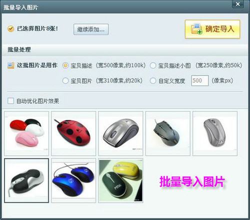 第一步:批量导入图片。运行“美图淘淘”,单击“批量导入图片”按钮,弹出“打开”窗口,进入存储网店图片的文件夹,选中需要的图片,单击“打开”按钮,就会弹出“批量导入图片”窗口,根据图片的要求勾选剪裁尺寸,或者自定义剪裁尺寸,最后单击“确定导入”按钮(如图5),就可以批量导入图片了。