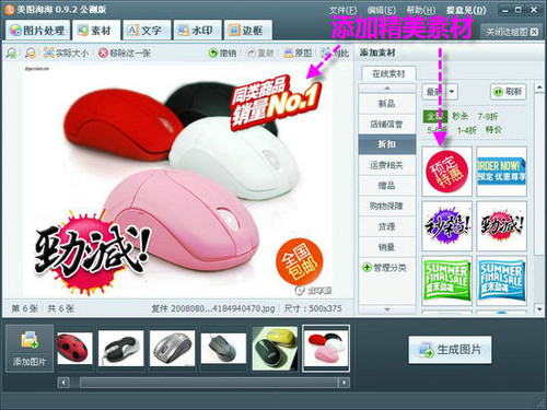 第二步:批量添加素材。将图片导入美图淘淘后,切换到“素材”窗口,从窗口右侧“在线素材”中选择并单击一种素材,素材自动叠加到图片上,调整好大小和位置,即可给网店图片批量加上素材(如图6)。