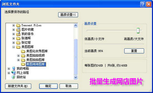 第三步:批量生成图片。处理好图片后,单击“生成图片”按钮,弹出“浏览文件夹”窗口,单击“画质设置”按钮,在“画质设置”窗口里,根据实际需要拖动滑块设置好画质,设置好保存位置,最后单击“确定”按钮后(如图7),即可批量生成网店图片。