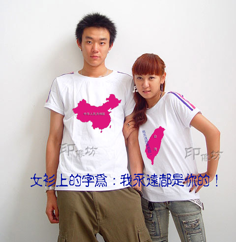 文化衫相信大家都穿过,但是不知道大家看没看见过一款情侣文化衫,男款上是中国大陆,女款上是台湾地图,并且文化衫一语双关的印着:“我永远属于你!”国庆本来就是传统意义上的结婚高峰期,这样一种既爱国又爱人且物美价廉的定制文化衫怎么会不受到热捧。