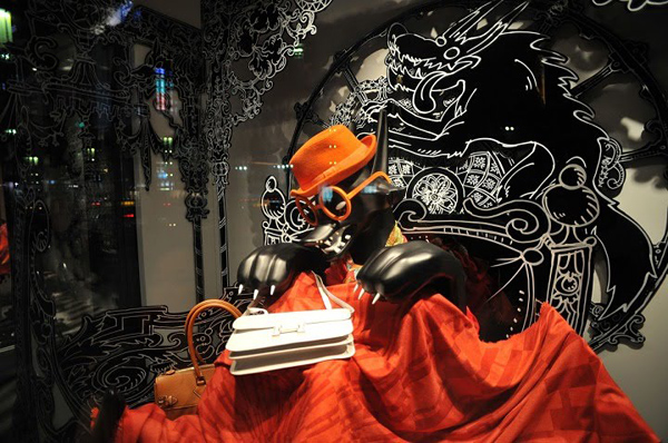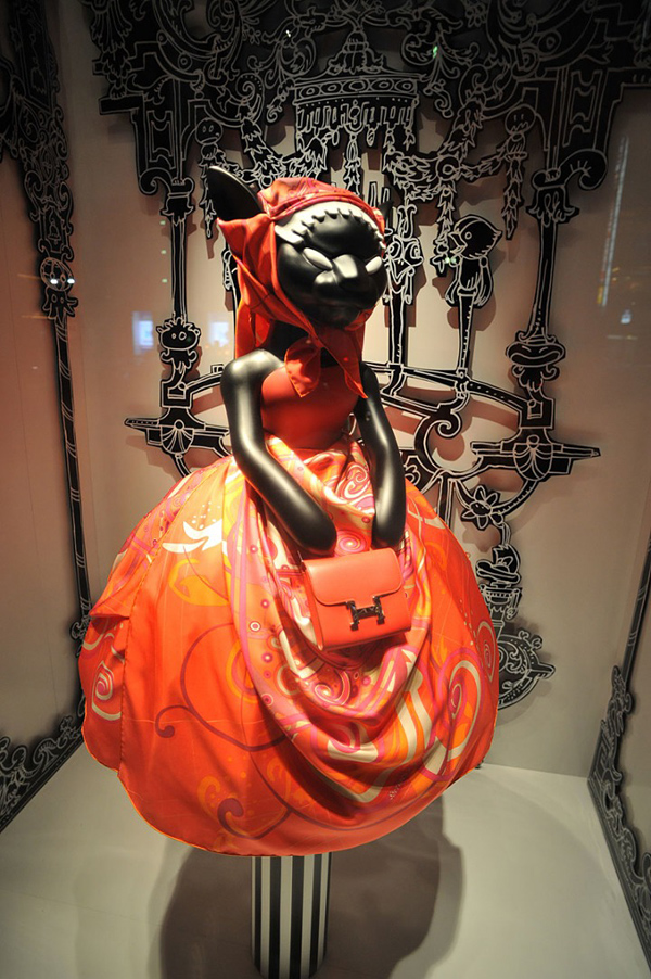 爱马仕(Hermes)位于东京银座的旗舰店为推广其围巾及手包产品,橱窗展示以“小红帽”为主题,但颠覆传统童话故事中的小红帽形象,通体黑色,造型邪恶,以凸显产品鲜艳的色彩;对应橱窗中的狼也同样淹没在围巾及手包中。