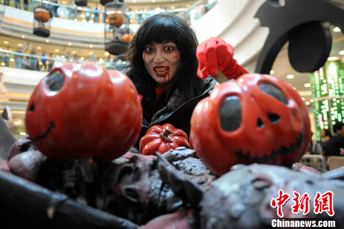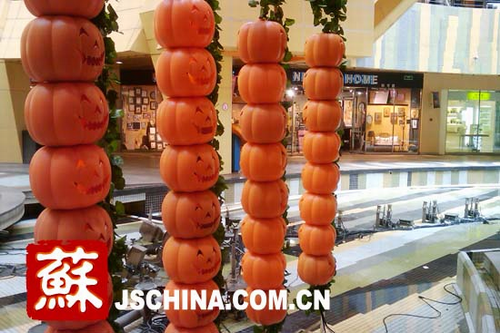 欧美很多家庭都会在万圣节举家亲自到地里挑选南瓜灯,然后做成格式古怪的南瓜灯,因此商场搞万圣节活动,南瓜灯的布置是必不可少的。图为南京某商场工作人员摆放万圣节道具: