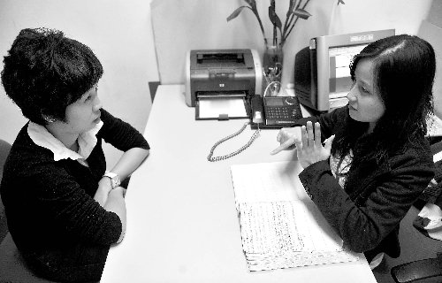 目前,培训内容已经完成并进行了结业考试,如果顺利,下周这些服务人员就将正式上岗。曾小姐是家乐福双桥子店客户服务人员,曾参加过手语培训,并在工作中用手语跟顾客交流过(如上图)。除了基础的日常用语之外,还学习了在商场购物时经常会用到的手语,如家电三包、索要发票、询问价格等等。不过,曾小姐虽然在一线,但真正碰到需要手语的残疾人却很少,她担心如果手语长期不用就会荒废掉,因此她建议开办培训班时,将教学内容刻录成光盘,以便经常对照练习。