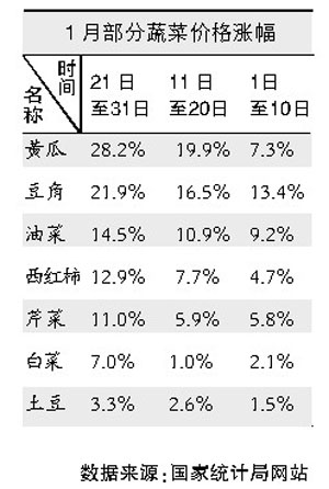 统计局9日公布的数据显示,1月下旬,50个城市主要食品平均价格普遍出现上涨,被监测的29种食品中27种出现上涨,其中黄瓜、豆角和油菜价格的涨幅高达28.2%、21.9%和14.5%。