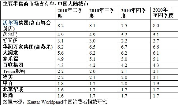 沃尔玛集团(假设沃尔玛和好又多完全整合)在2010年四季度,仍然保持在华零售市场的领先地位,拥有7.5%的市场占有率,并渗透进了18.4%的中国城市家庭。