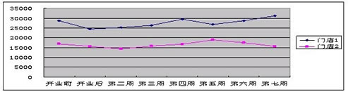 区域内这12家门店分别由两个区经理管理,区域贡献率遥遥领先,是A企业最有利润产出的区域。区域购 万达广场对A企业门店的影响 商业竞争不是战场,却胜似战场,利润稀释,就是流血。万达购物中心的开业,特别是其中乐购超市强有竞争力的开业,在生鲜品的带动下,开业造势效果很不错,将周边社区居民吸引到了店中,后续波段性活动的力度也较大。价格战是最有效的打压对手的方式,乐购也不例外。这让分布在万达广场周边A企业连锁店有点招架不住,对方开业第一个月,门店每天销售额下降,利润下降,可以说每天都在流血。图表2是一组数据,能看出因竞争店开业对A企业其中一家店的影响,包括销售额与来客数的下滑走势。