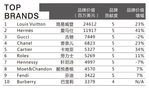 | 全球奢侈品牌价值排名TOP10 | ||||||